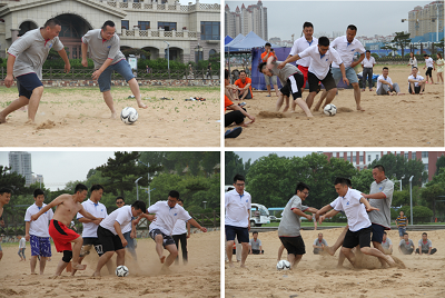通過(guò)前面三個(gè)緊張的比賽之后,決出了四個(gè)隊伍進(jìn)行終極項目—沙灘足球比賽。比賽中我們全體成員手拉手圍出了一個(gè)足球場(chǎng),大家既是邊界,又是觀(guān)眾,參與感非常強。每一次斷球,都有搶奪競爭對手客戶(hù)時(shí)的喜悅;每一次傳球,都是團隊隊員相互之間的信任;每一次帶球奔馳,都像手握項目漏斗有底氣;最后的臨門(mén)一腳,像揮灑汗水拿到了訂單,充滿(mǎn)了愉悅??粗?zhù)大家在金沙上努力拼搏的樣子,我們激情高漲,抬頭看了看海的遠方,心中充滿(mǎn)了愛(ài)與喜悅。